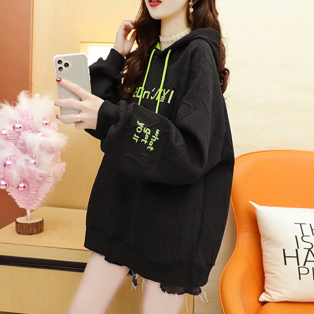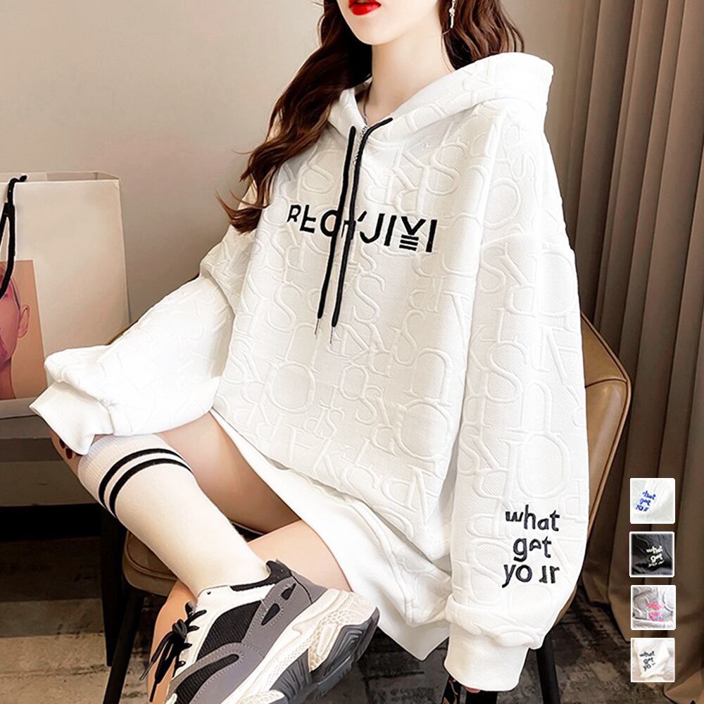 レディース フード付きスウェット 体型カバー 英字ロゴ フーディー 韓国風 ロングトレーナー 春秋冬ゆったり ストリート